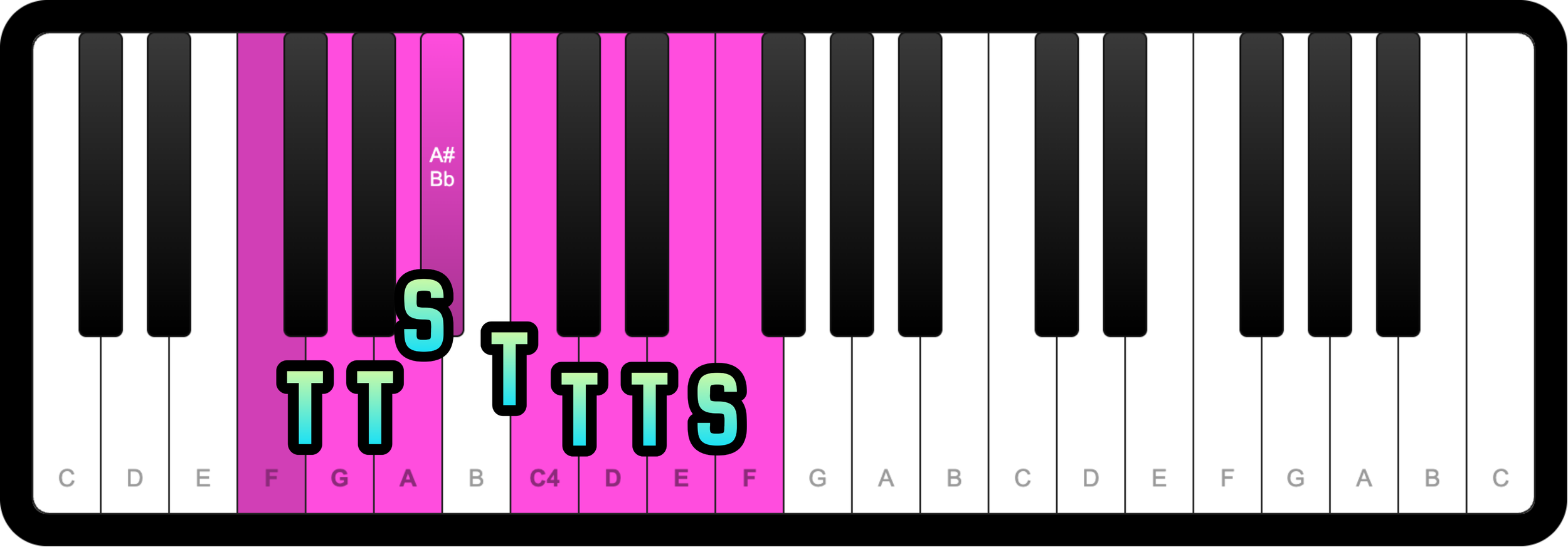 F (+T) G (+T) A (+S) Bb (+T) C (+T) D (+T) E (+S) F