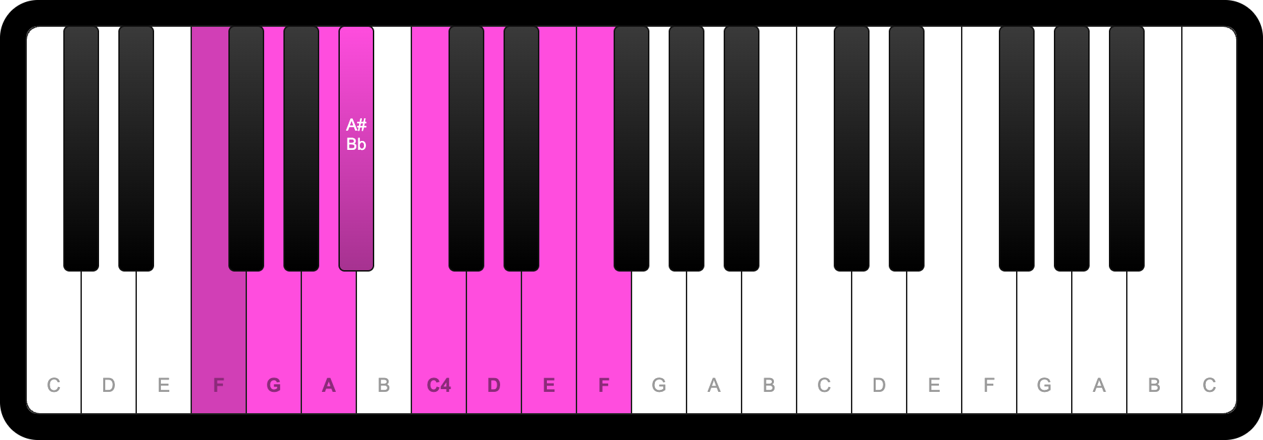 F, G, A, Bb, C, D, E, F